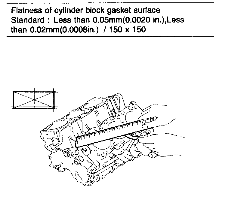 3. Inspect top surface of cylinder block for flatness. Using a precision straight edge and feeler gauge, measure the surface contacting the cylinder head gasket for warpage.