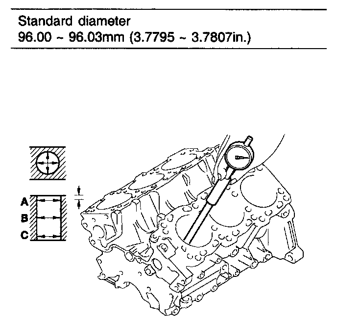 Using a cylinder bore gauge, measure the cylinder bore diameter at position in the thrust and axial directions.