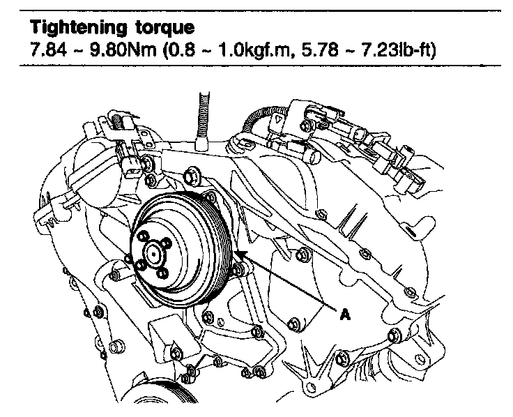 2. Install the 4 bolts and pump pulley(A).