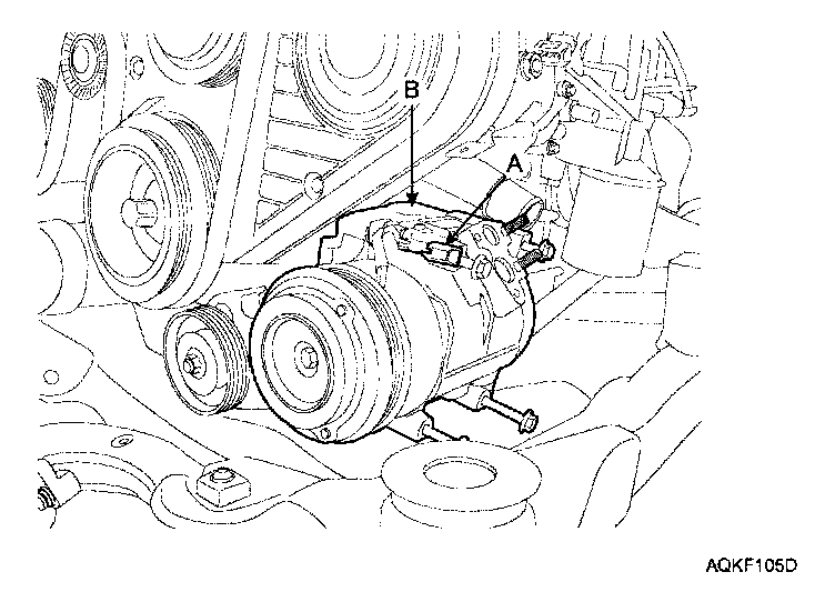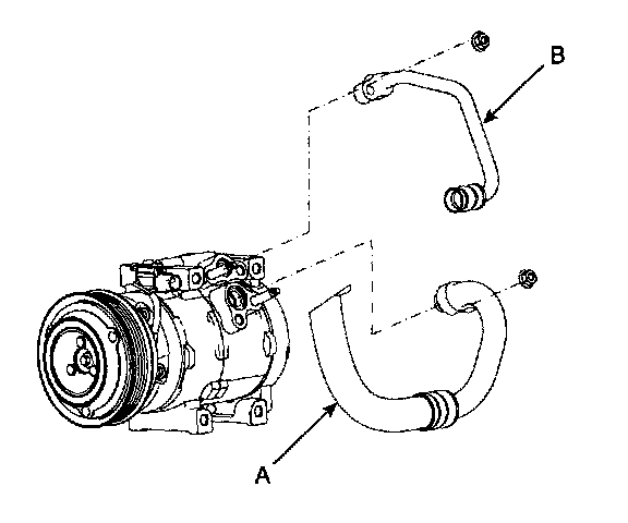 5. Remove the bolts, then disconnect the suction line (A) and discharge line (B) from the compressor. Plug or cap the lines immediately after disconnecting them to avoid moisture and dust contamination.