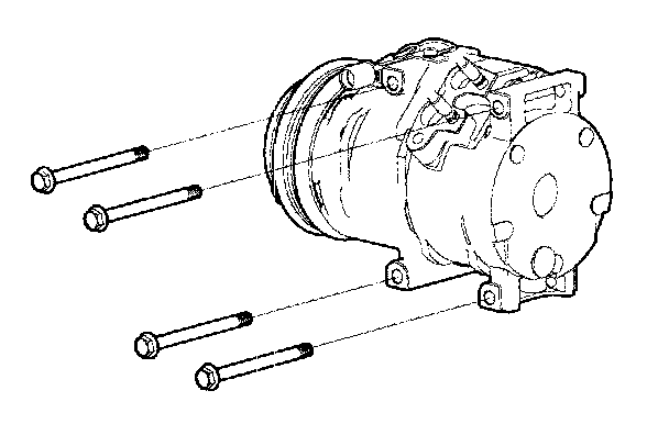 6. Disconnect the compressor clutch connector (A), and then remove 4 mounting bolts and the compressor.