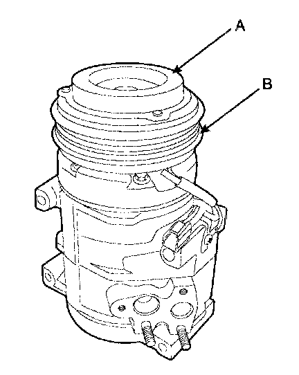 2. Check the pulley (B) bearing play and drag by rotating the pulley by hand. Replace the clutch set with a new one if it is noisy or has excessive play/drag.