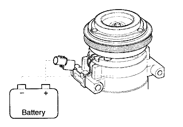 4. Check operation of the magnetic clutch. Connect the compressor side terminals to the battery (+) terminal and the ground battery (-) terminal to the compressor body.