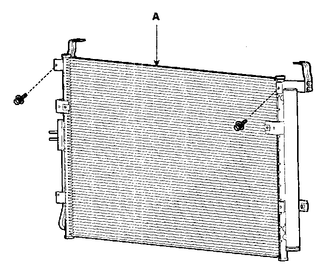 4. Remove 2 bolts, and then remove the condenser (A) by lifting it up. Be careful not to damage the radiator and condenser fins when removing the condenser.