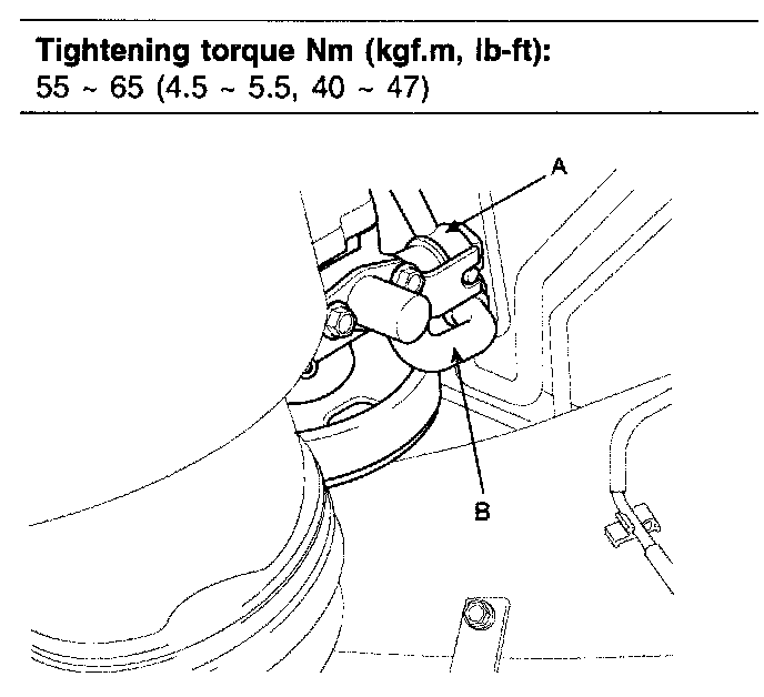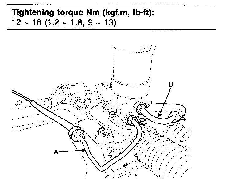 2. Disconnect the pressure tube (A) and suction tube (B) from the power steering oil pump.