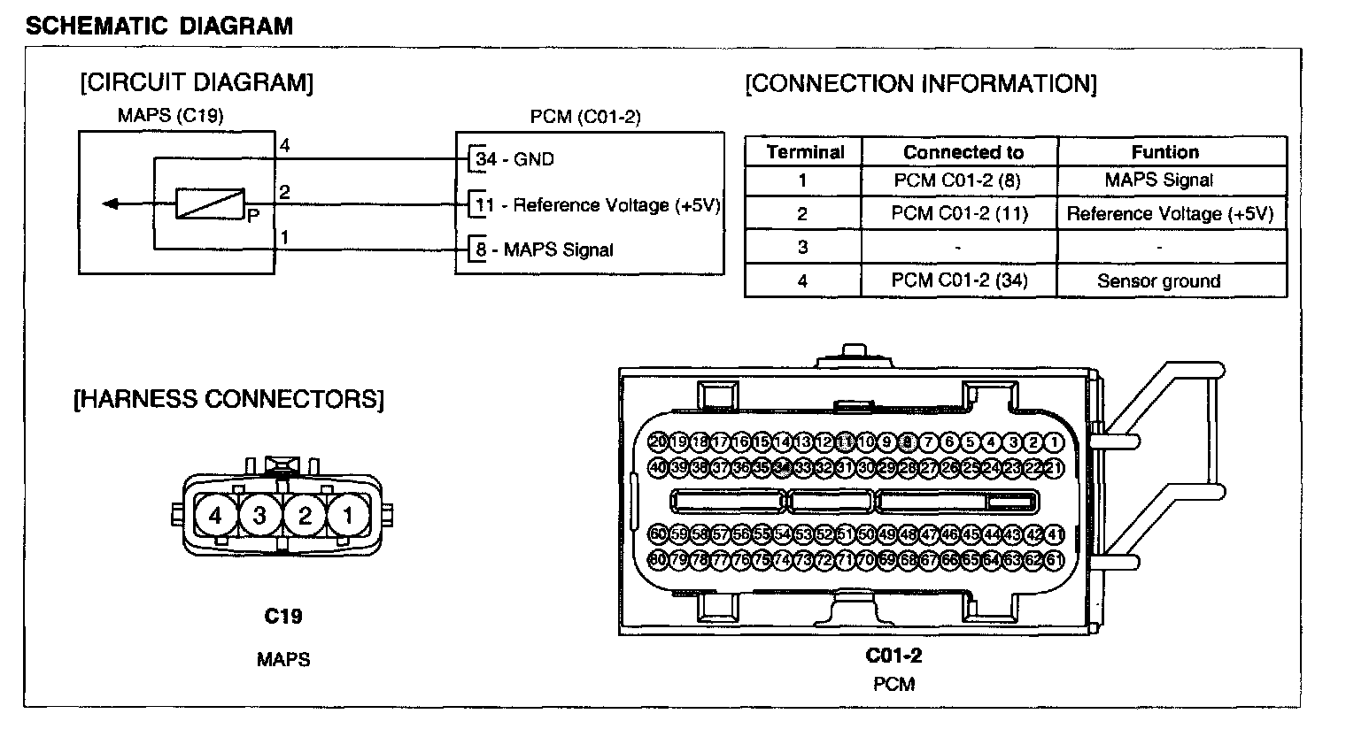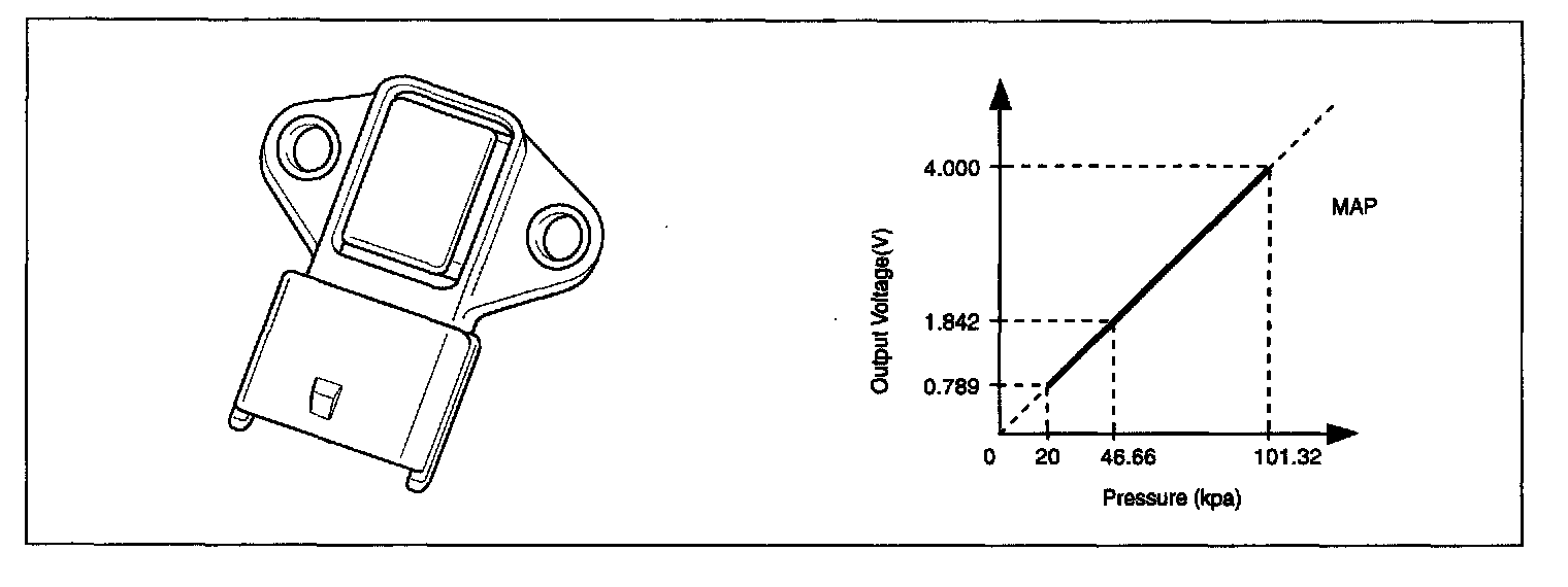 Manifold Absolute Pressure Sensor (MAPS) is speed density type sensor and is installed on the surge tank. This MAPS senses absolute pressure in surge tank and transfers this analog signal proportional to the pressure to the PCM. The PCM calculates the intake air quantity and engine speed based on this signal. This MAPS consists of piezoelectric element and hybrid IC that amplifies the element output signal. The element is silicon diaphragm type and adapts pressure sensitive variable resistor effect of semiconductor. 100 % vacuum and the manifold pressure applies to both sides of it respectively. That is, this sensor outputs the silicon variation proportional to pressure change by voltage.
