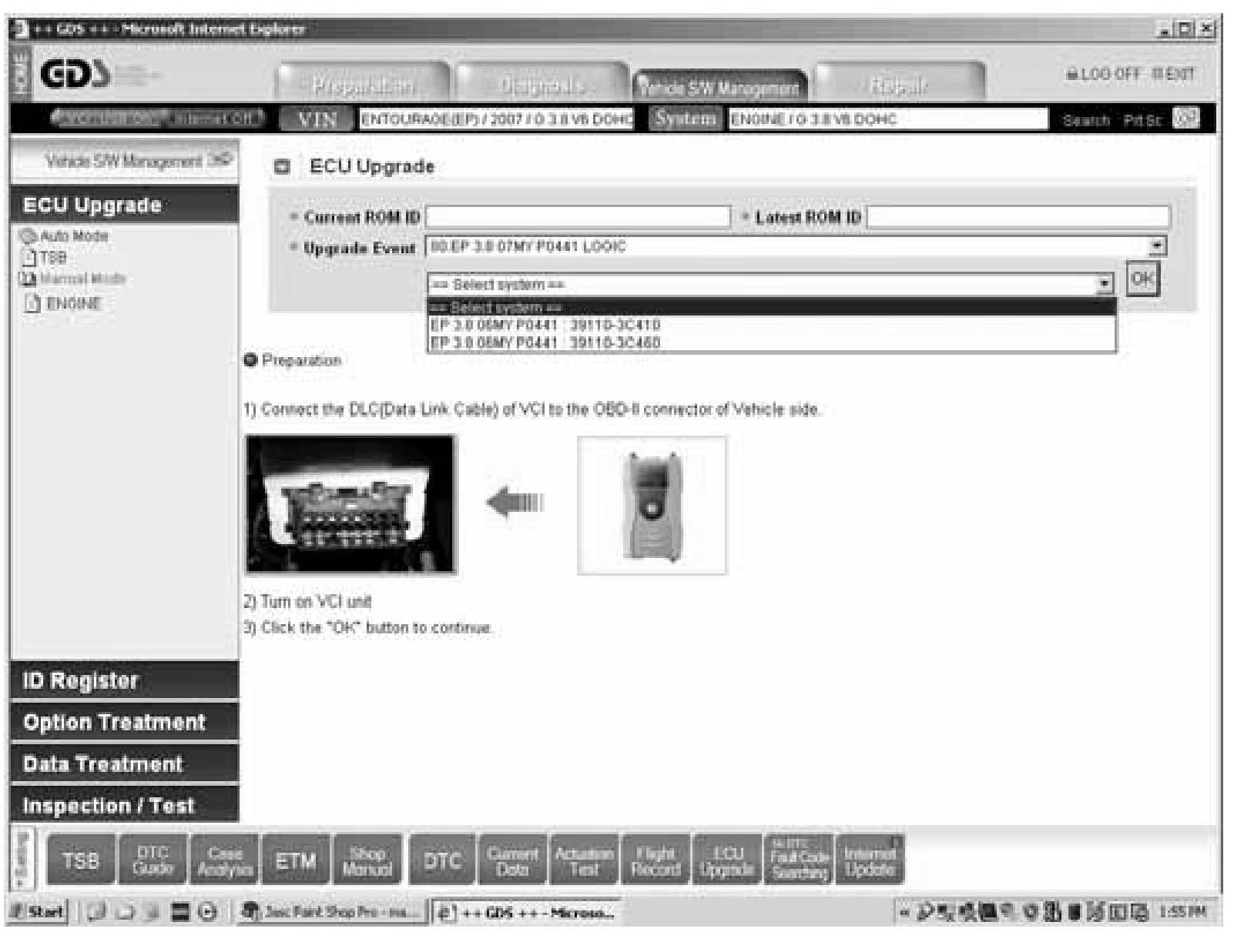 1. Connect the GDS VCI module to the vehicle's DLC connector and the USB cable between the VCI and GDS laptop's USB port.