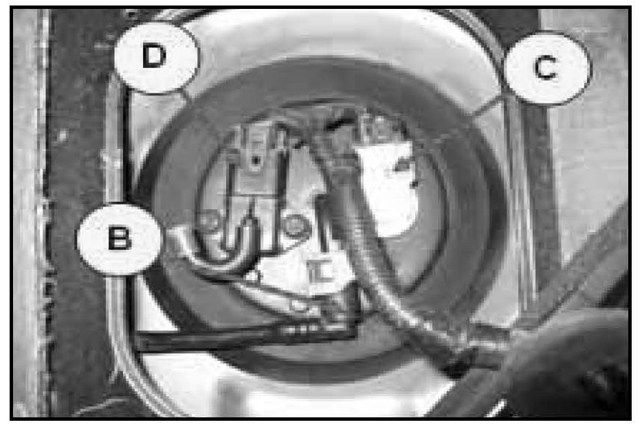 4. Disconnect the fuel feed line (B), the fuel pump power connector (C), and the fuel tank pressure sensor connector (D).