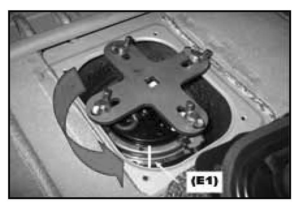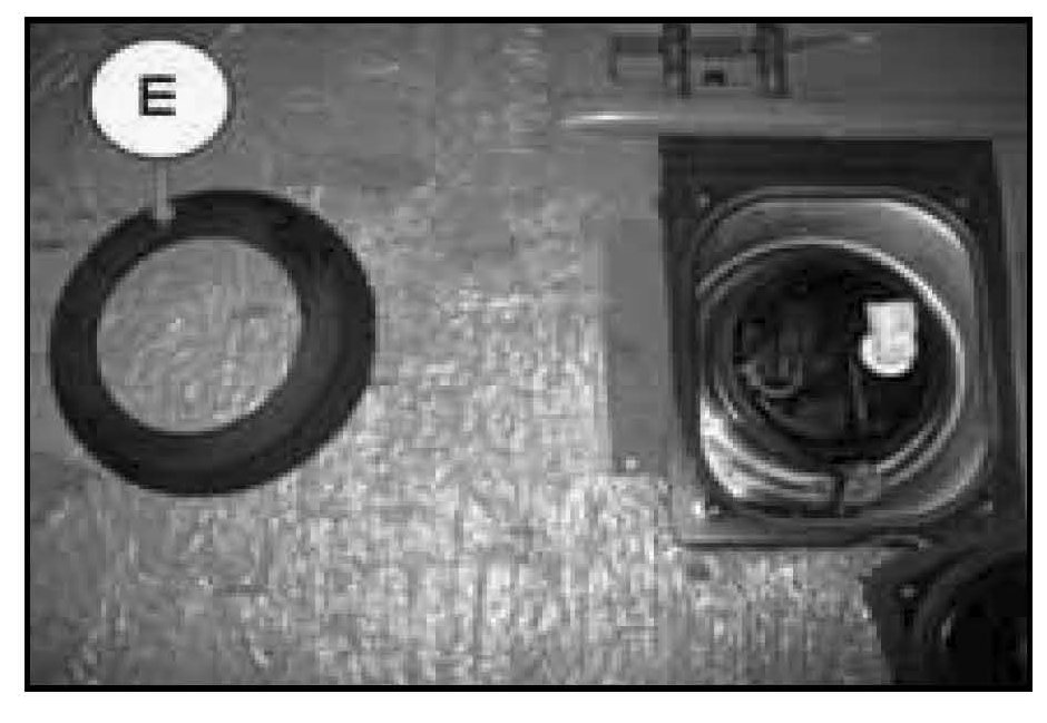 5. Remove the fuel pump rubber seal (E) to gain access to the fuel pump lock ring.