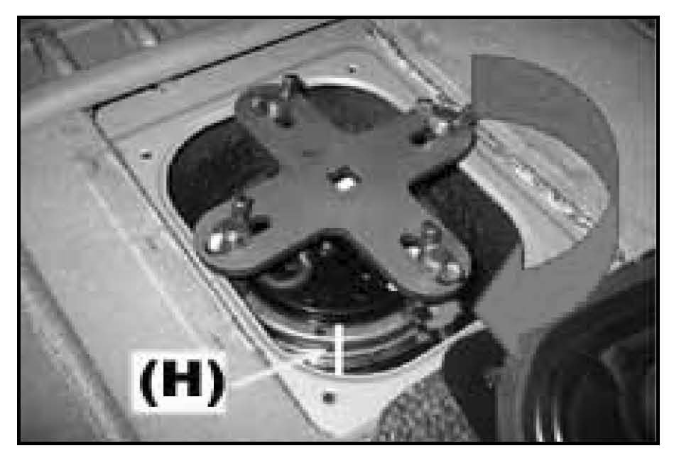 10. Tighten by turning the lock ring (clockwise) 1-1/2 turns making sure that the mark made on the lock ring (from step 6) matches the mark on the fuel tank body (H).