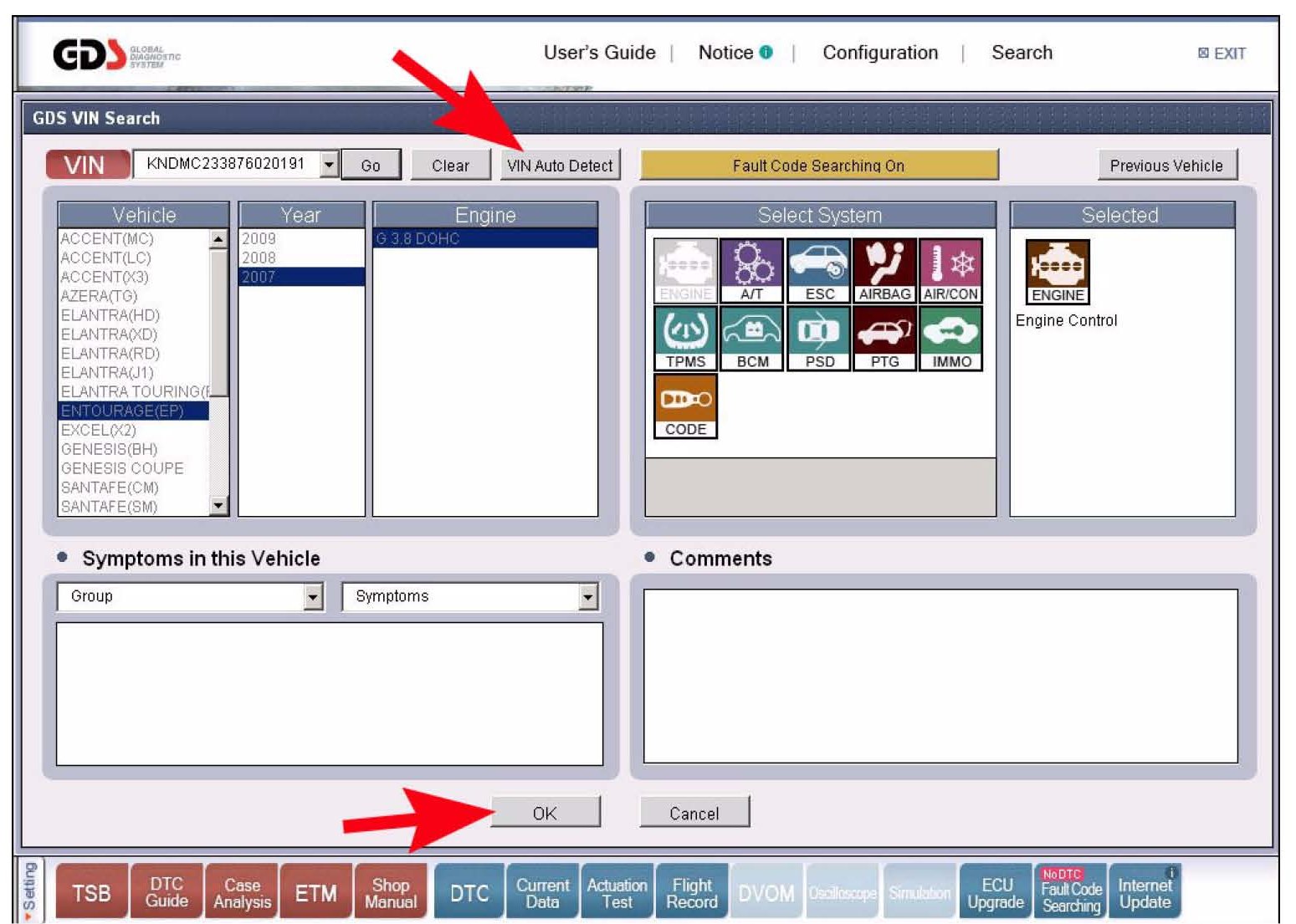 5. Press the VIN Auto Detect button to automatically read the vehicle's VIN (or you will need to manually enter vehicle, year, and engine if it does not automatically read this information) then press Engine Control for system followed by the OK button at the bottom of the screen.