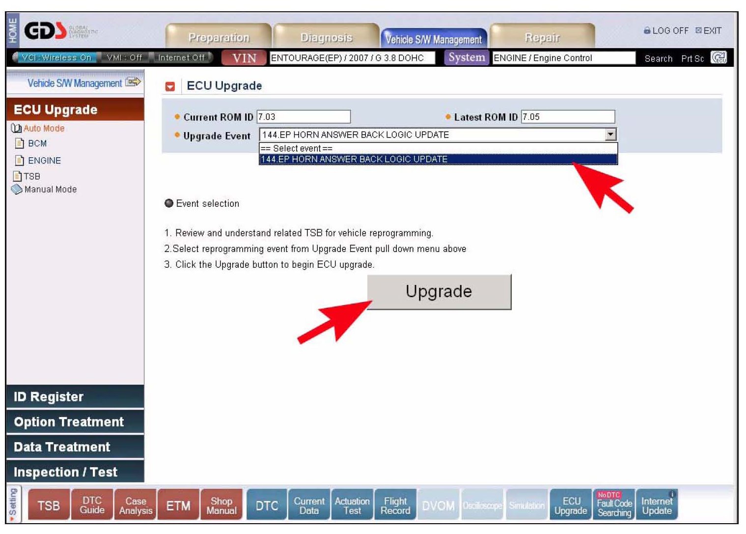 10. The screen will automatically display Upgrade Event 144 EP HORN ANSWER BACK LOGIC UPDATE. Select the event and press the UPGRADE button as shown in the screen below.