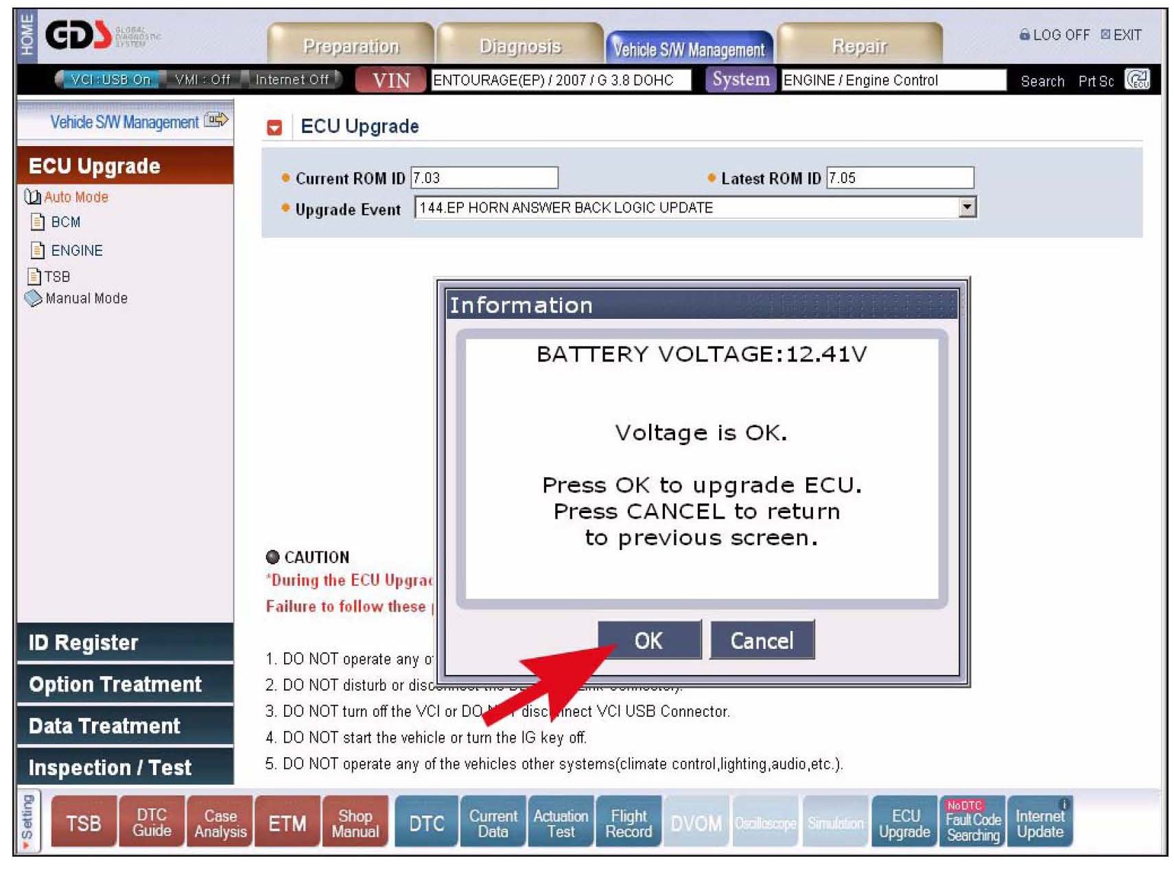 12. The battery voltage is verified to make sure it is at least 12 volts to ensure reliable update results. Click OK if the results indicate the voltage is OK.