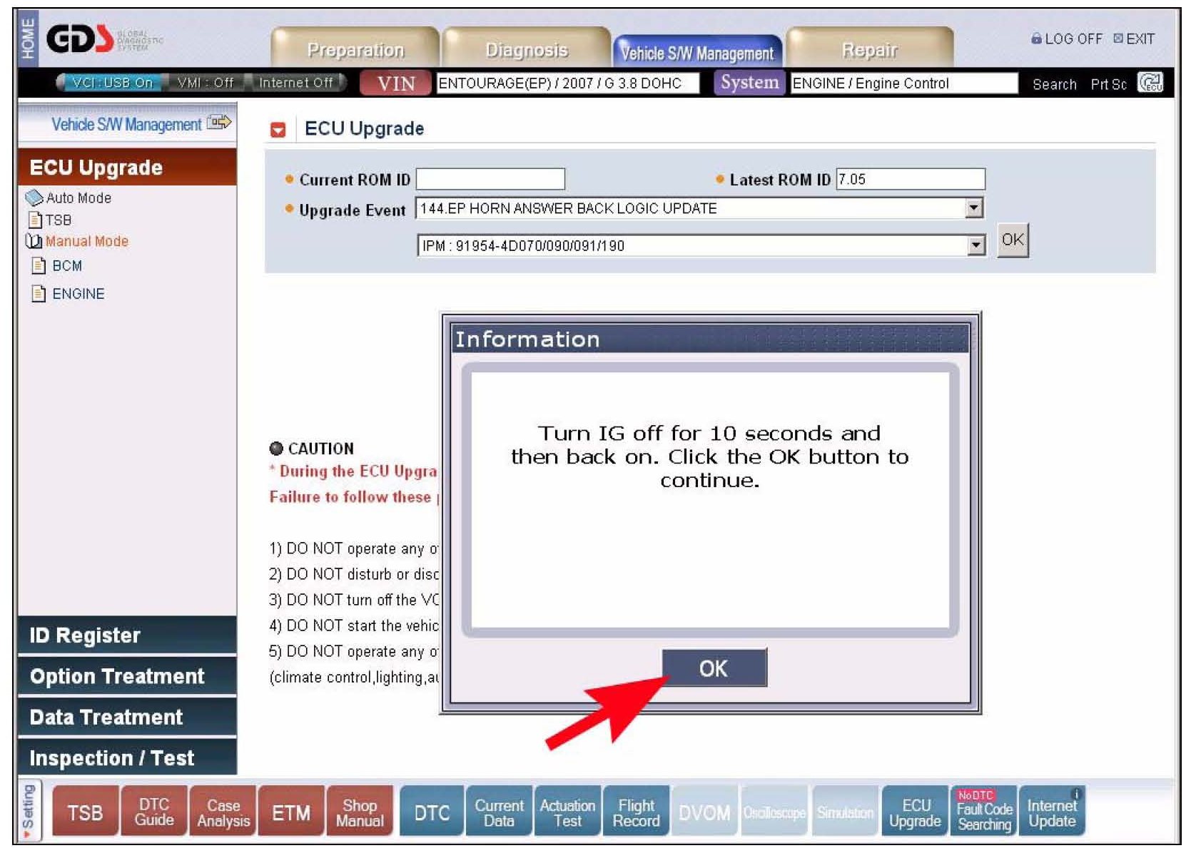 14. Update will occur until 100% is reached on the bar graph. Turn off the ignition power for a minimum of 10 seconds and then turn it back on. Click OK on the screen.