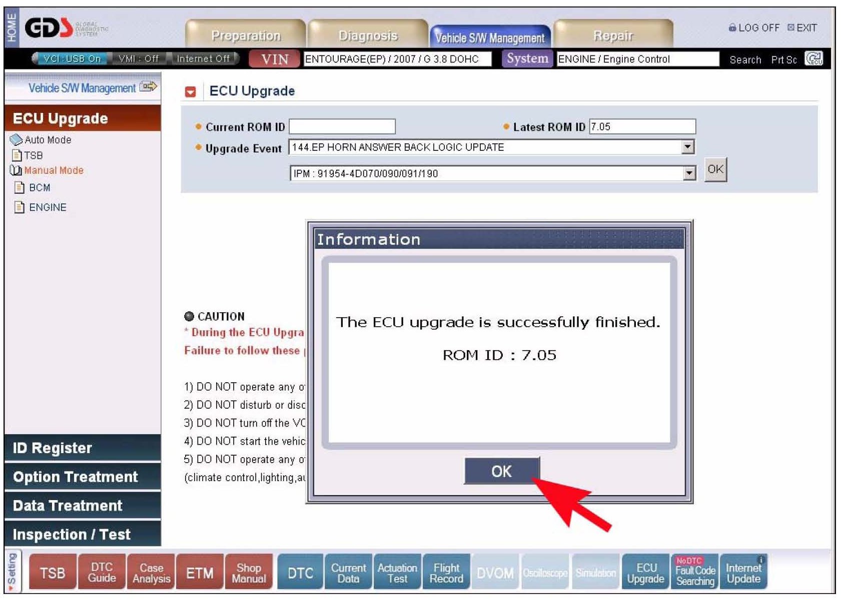 15. The reprogramming mode has been completed successfully when the following confirmation pop-up screen appears. Click the OK button.