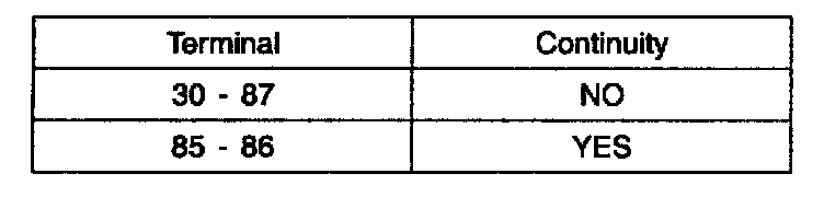 4. Apply 12 V to terminal 85 and ground to terminal 86. Check for continuity between terminals 30 and 87.