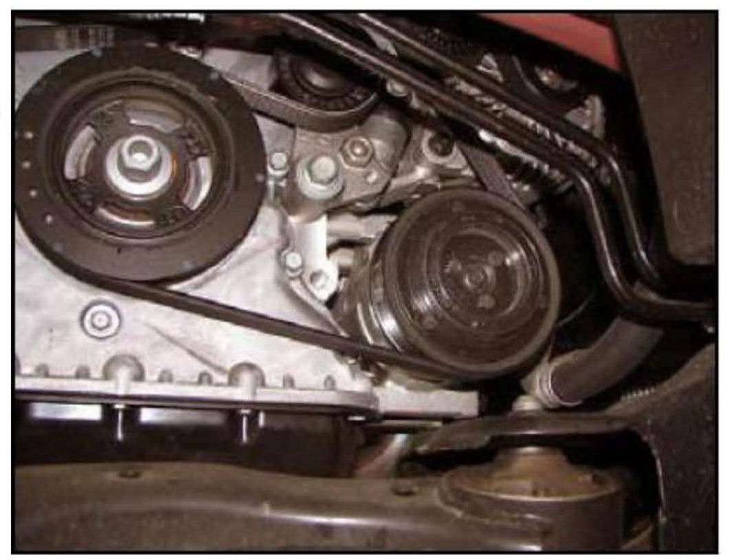 2. Remove the lower engine shield from the wheel well area to expose the A/C compressor / drive belt area, as shown in the photo.