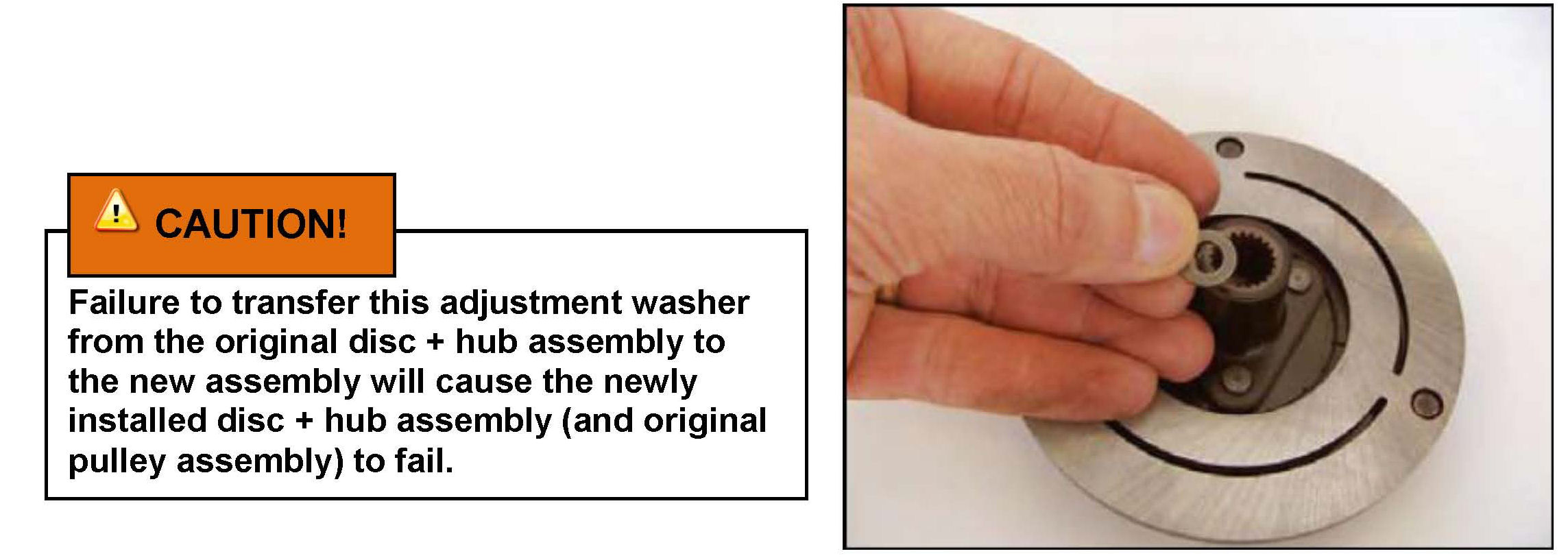 6. Transfer the original disc + hub clearance adjustment washer to the new redesigned disc + hub assembly.