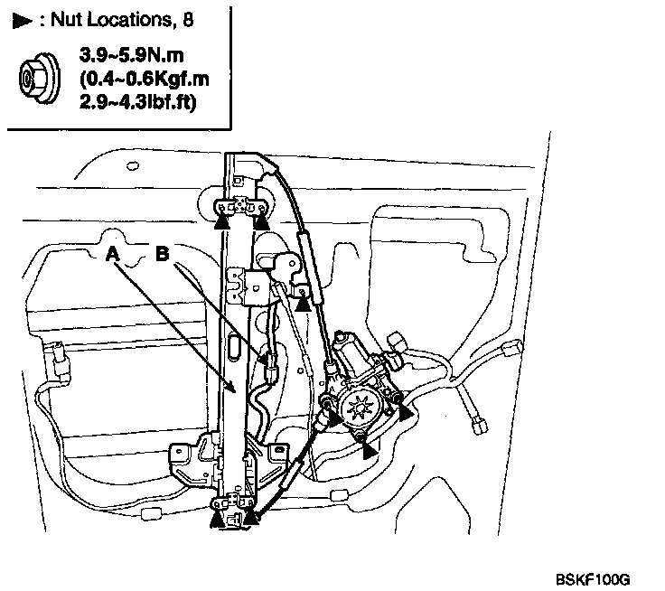 3. After loose the dooring module mounting nuts, remove the window regulator (A).