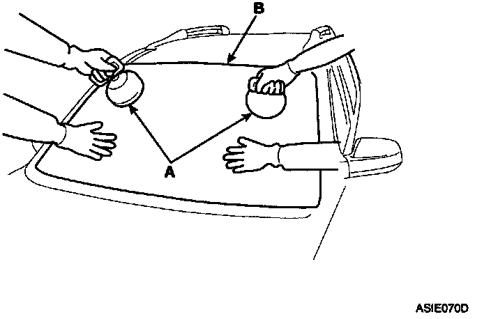 9. Use suction cups (A) to hold the windshield over the opening, align it with the alignment marks (B) made in step 15, and set it down on the adhesive. Lightly push on the windshield until its edges are fully seated on the adhesive all the way around. Do not open or close the doors until the adhesive is dry.