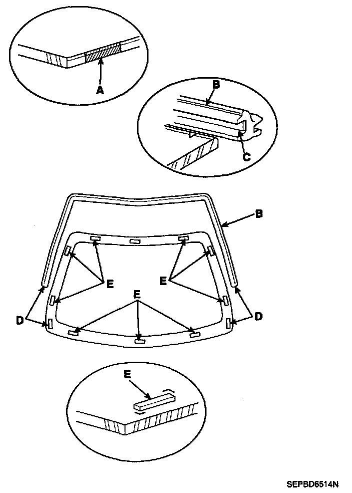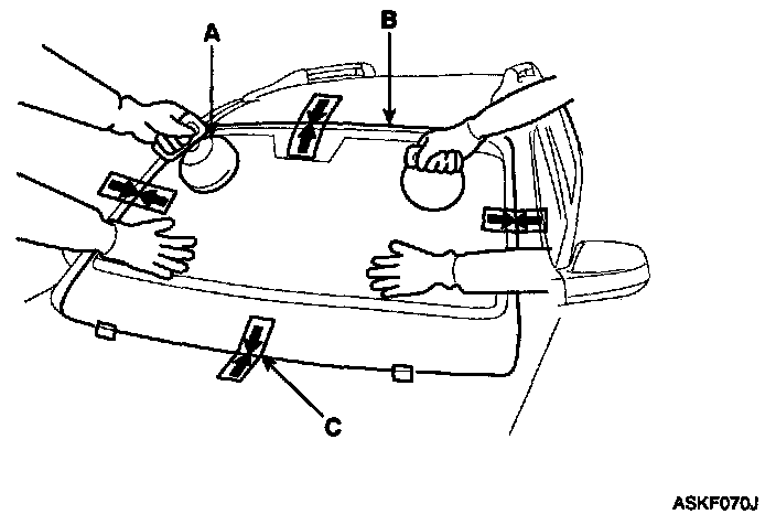 3. Install the windshield (A) upper molding (B) and fasteners (C). Do not allow any gaps.