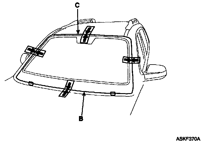 4. Install the spacer (A) install the windshield glass (B) temporarily with making sure to position them on the center, and then place the alignment mark (C).