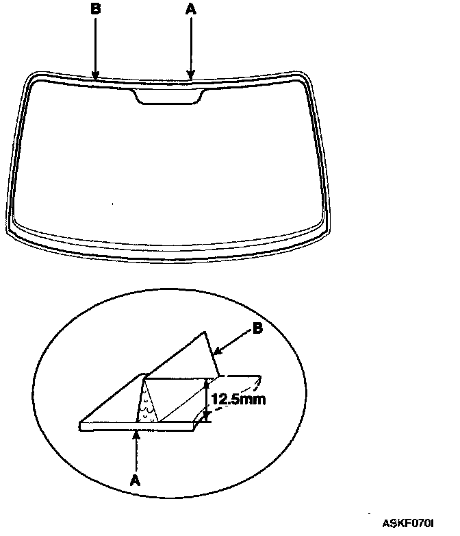 8. Pack adhesive into the cartridge without air pockets to ensure continuous delivery. Put the cartridge in a caulking gun, and run a bead of adhesive (A) around the edge of the windshield (B) between the fastener and molding as shown. Apply the adhesive within 30 minutes after applying the glass primer. Make a slightly thicker bead at each corner.