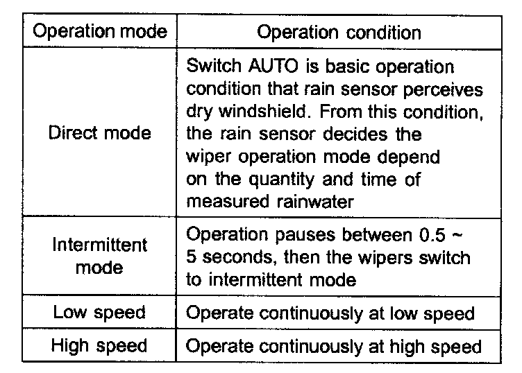 The Rain sensing windshield wiper system is a wiper system that, in addition to providing normal wiper functions off, mist, manual low speed, manual high speed, and wash, provides automatic control of automatic intermittent automatic low, and automatic high speeds.