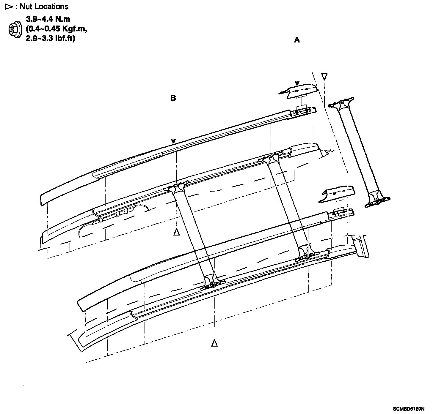 3. After loosening the mounting nuts, then remove the roof rack (B).