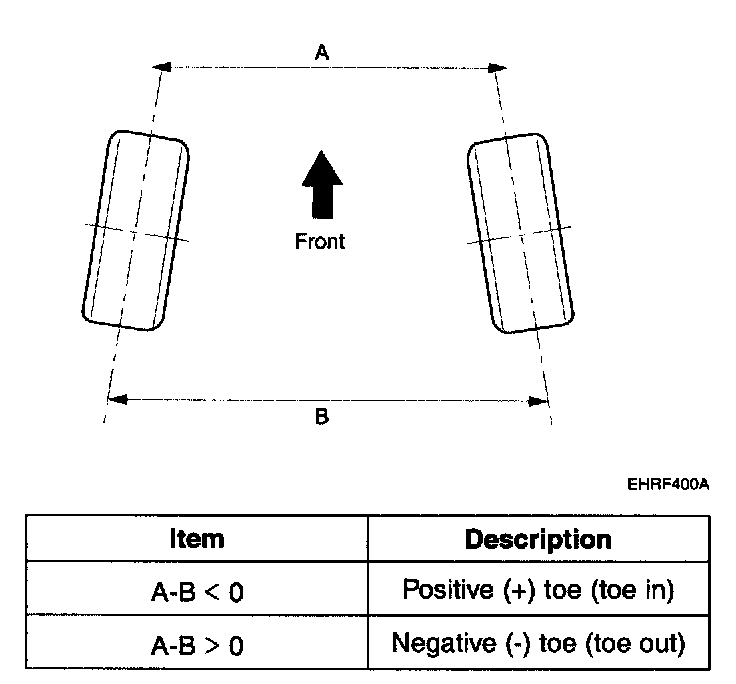 When the wheels are turned in toward the front of the vehicle, toe is positive (+) (toe in). When the wheels are turned out toward the front of the vehicle, toe is negative (-) (toe out). Toe is measured in degrees, from side to side, and totaled.