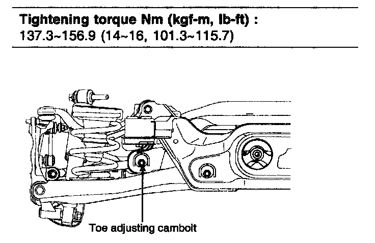 ^ Each toe should be within 1±1 mm (0.039± 0.039 in). If the difference between right and left is not within +2mm (0.079 in), repeat adjustment. After adjusting the cambolt, tighten the nut to the specified torque.