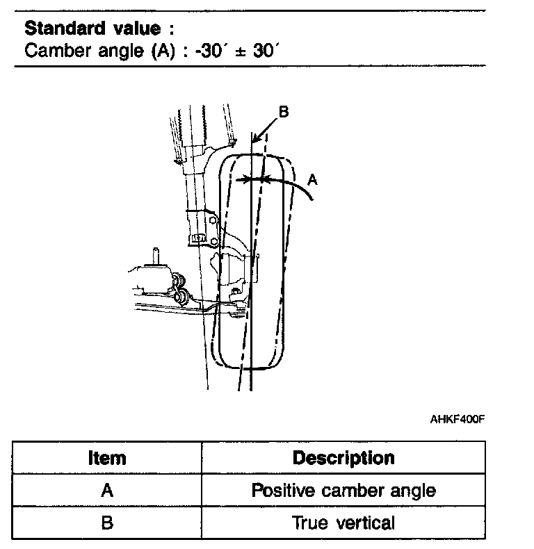 NOTE: Camber is pre-set at the factory and doesn't need to be adjusted. If the camber is not within the standard value, replace the bent or damaged parts.