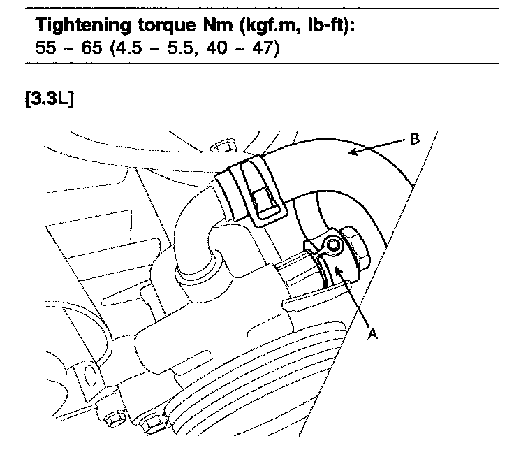 2. Disconnect the pressure tube (A) and suction hose (B) from the power steering oil pump.