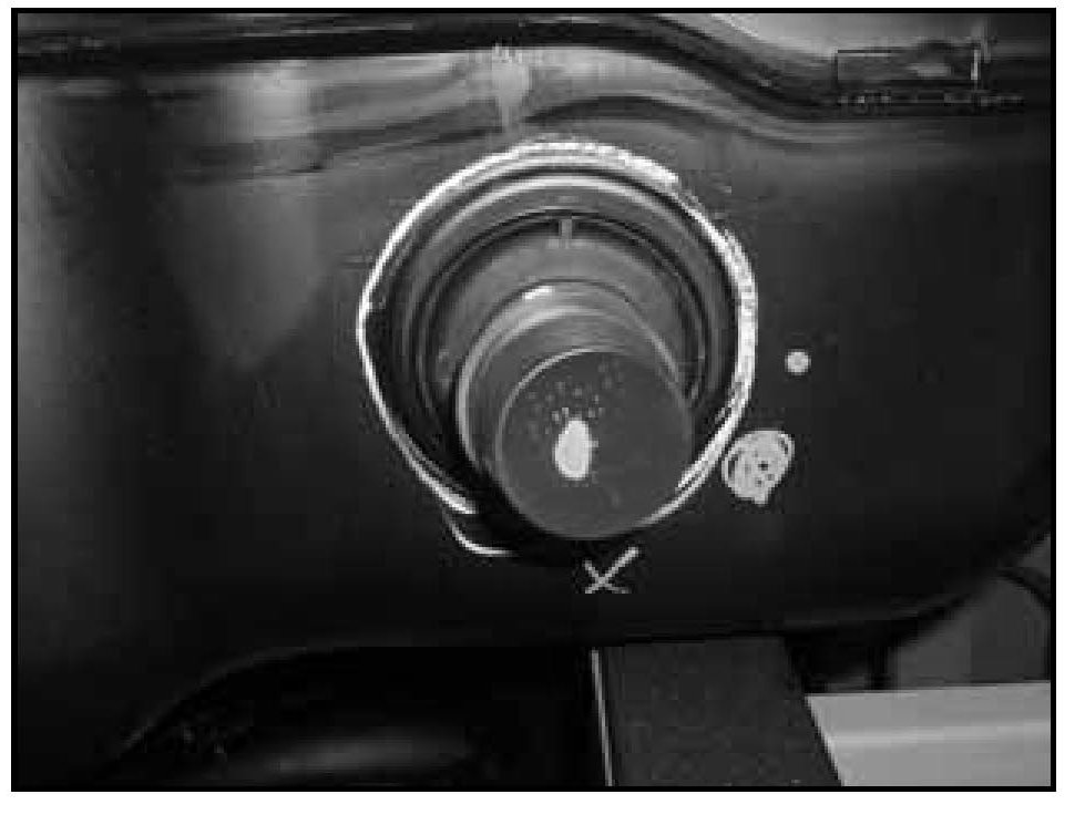 12. Using an inspection mirror and flashlight, place the mirror at the top rear center of the fuel tank and locate the fuel tank production label.