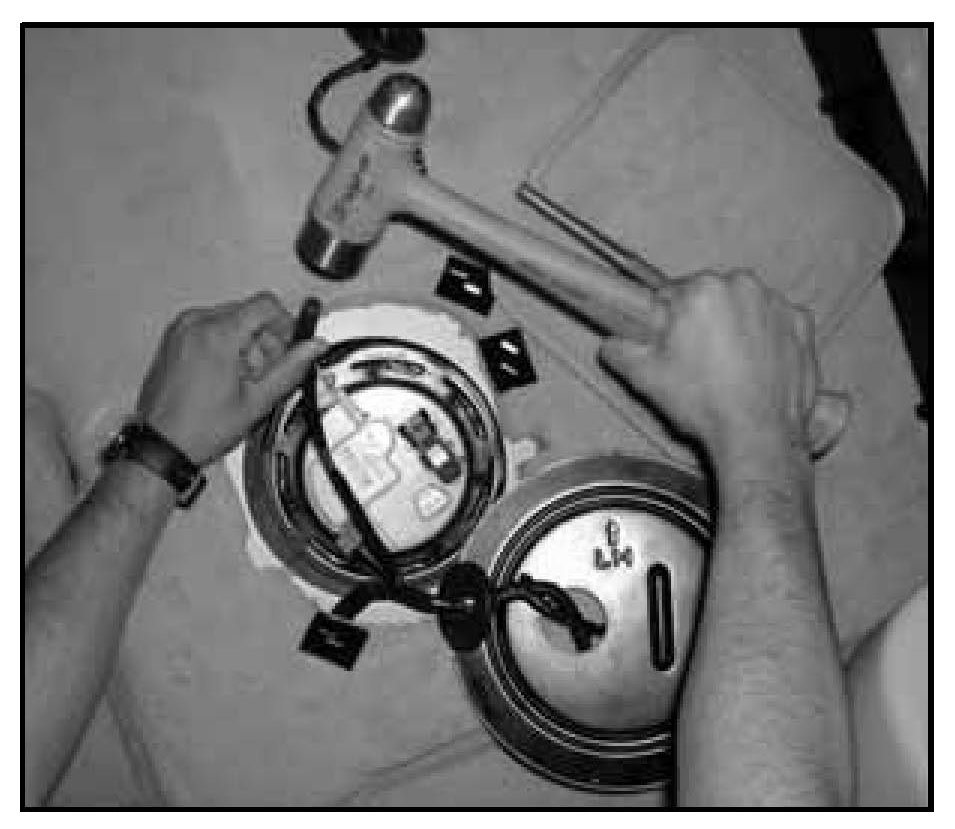 25. Using a brass drift, hammer the fuel pump retaining ring in a counter clockwise direction. Remove the fuel pump assembly using caution not to spill fuel. Drain the fuel into a suitable container through the removed fuel pump opening using a hand pump.