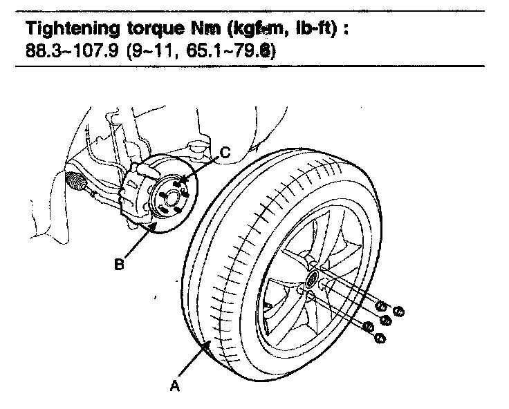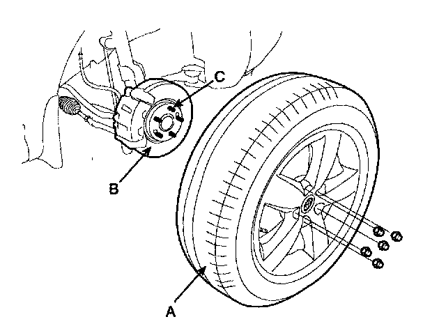 CAUTION: Be careful not to damage to the hub bolts (C) when removing the front wheel and tire (A).