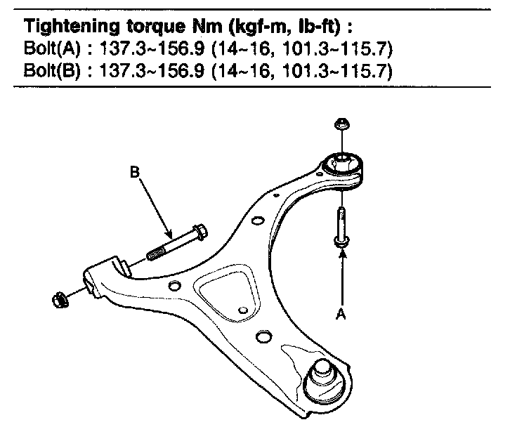 1. Install the lower arm and then tighten the lower arm mounting bolts (A, B).