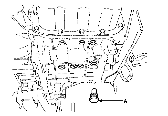 3. Remove the drain plug (A) from the bottom of the transmission case to drain the fluid.