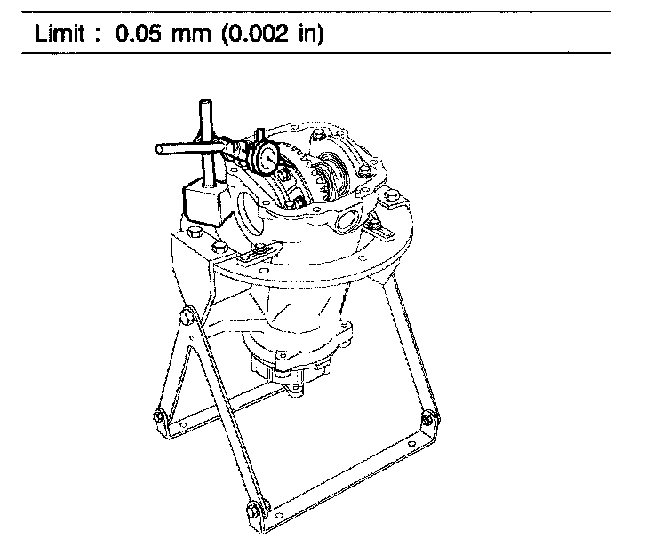 2) If the runout is beyond the limit, check that there are no foreign substances between the drive gear and differential case and, that the bolts fixing the drive gear are not loose.