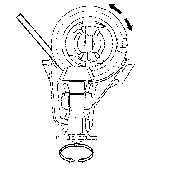 2) Insert a brass rod between the differential carrier and the differential case, and then rotate the companion flange by hand (once in the normal direction, and then once in the reverse direction) while applying a load to the drive gear so that some torque (approximately 25-30Nm) is applied to the drive pinion.
