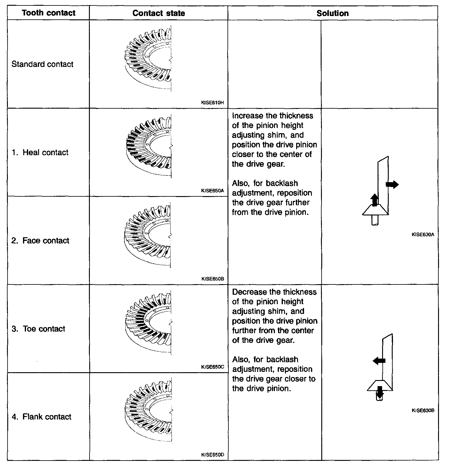 ^ Tooth contact pattern is a method for judging the result of the adjustment of drive pinion height and final drive gear backlash. The adjustment of drive pinion height and final drive gear backlash should be repeated until the tooth contact patterns are similar to the standard tooth contact pattern.