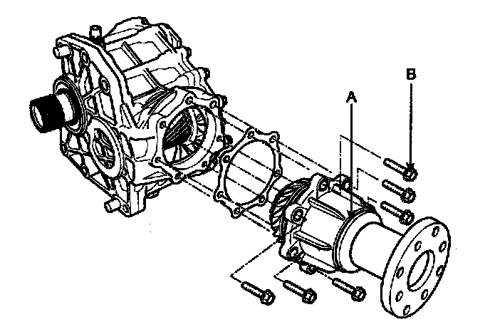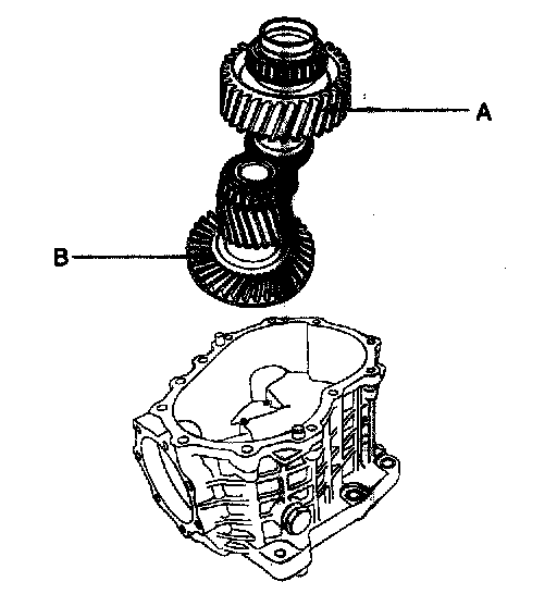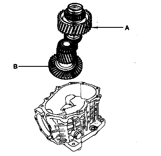 5. Remove the transfer drive gear assembly (A) and the hypoid gear shaft assembly (B) from the transfer housing.