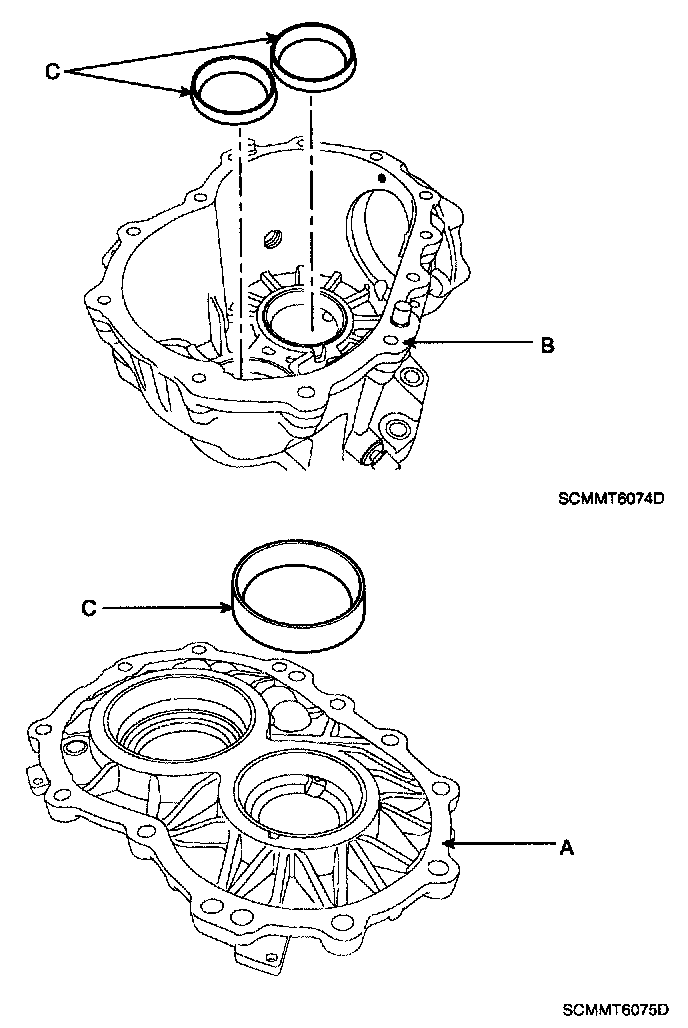 8. Using a sliding hammer, remove the taper roller bearing outer races (C) from the transfer cover (A) and housing (B).