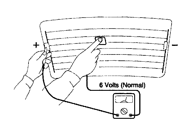 1. Turn on the defogger switch and use a voltmeter to measure the voltage of each heater line at the glass center point. If a voltage of approximately 6 V is indicated by the voltmeter, the heater line of the rear window is considered satisfactory.