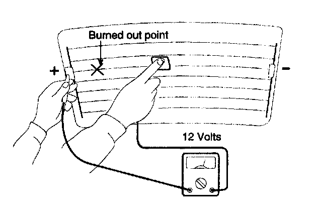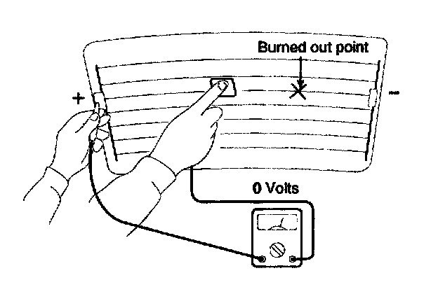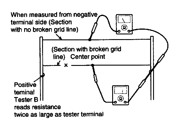 5. Use an ohmmeter to measure the resistance of each heater line between a terminal and the center of a grid line, and between the same terminal and the center of one adjacent heater line. The section with a broken heater line will have a resistance twice as that in other sections. In the affected section, move the test lead to a position where the resistance sharply changes.