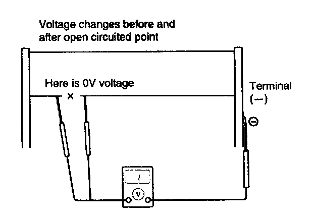 4. To check for open circuits, slowly move the test lead in the direction that the open circuit seems to exist. Try to find a point where a voltage is generated or changes to 0 V. The point where the voltage has changed is the open-circuit point.