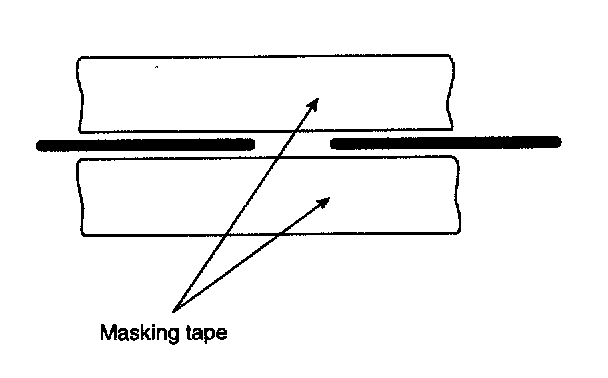 Wipe the glass adjacent to the broken heater line, clean with silicone remover and attach the masking tape as shown. Shake the conductive paint container well, and apply three coats with a brush at intervals of about 15 minutes apart. Remove the tape and allow sufficient time for drying before applying power. For a better finish, scrape away excess deposits with a knife after the paint has completely dried. (Allow 24 hours).