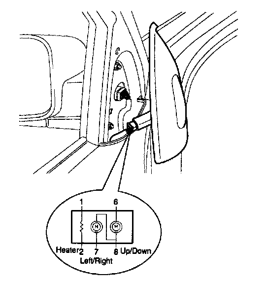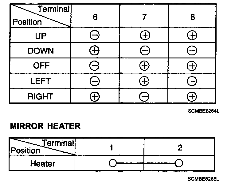 3. Apply battery voltage to each terminal as shown in the table and verify that the mirror operates properly.