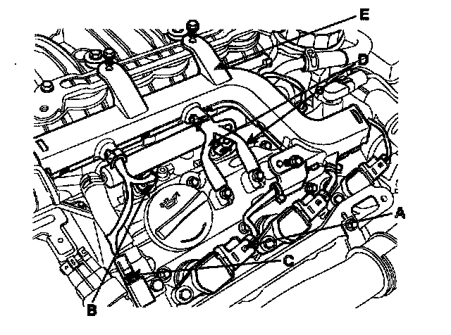 7) Disconnect LH ignition coil connector(A), injector connector(B), condenser connector(C) and ground(D), and remove wiring harness protector(E).