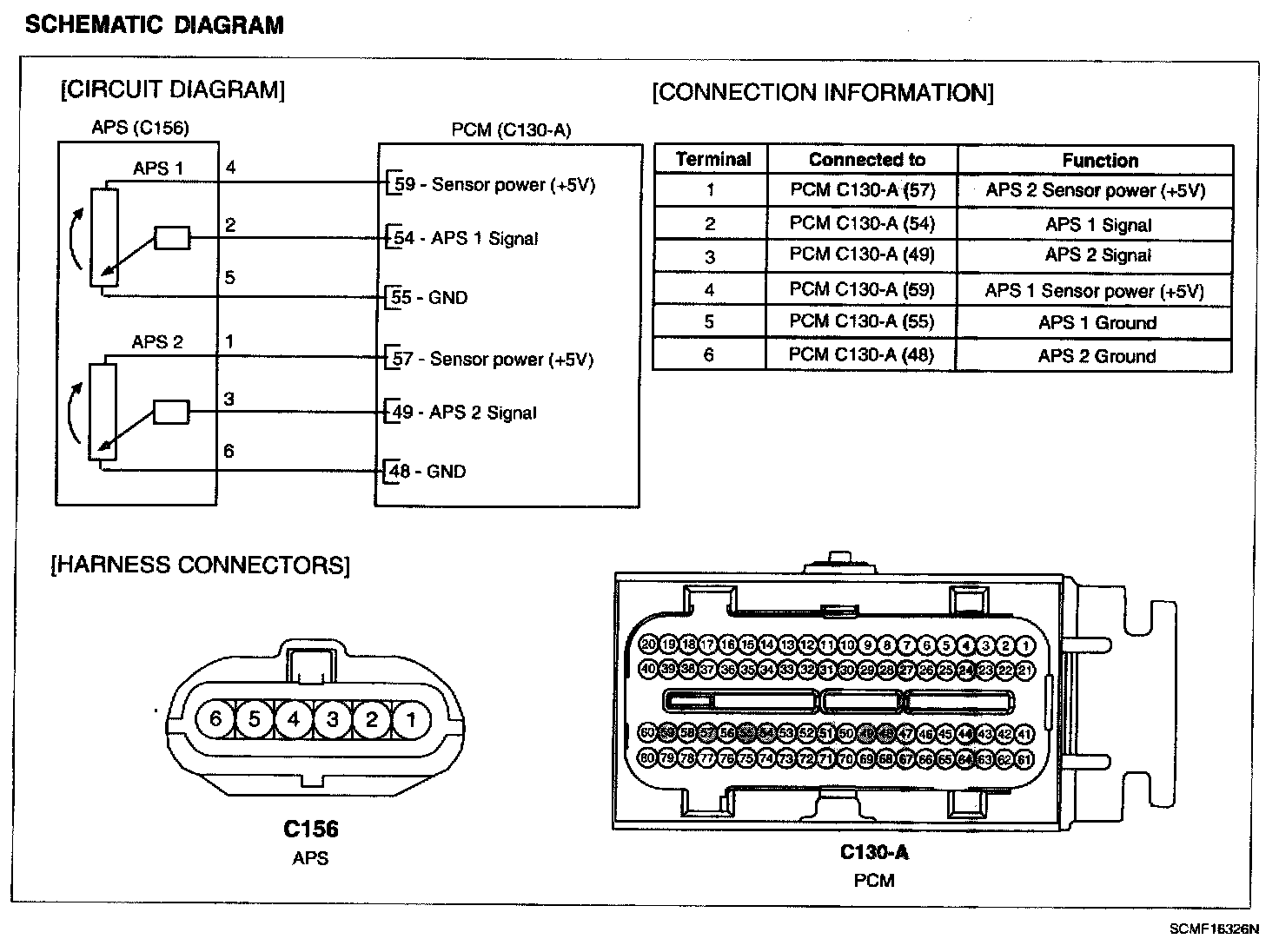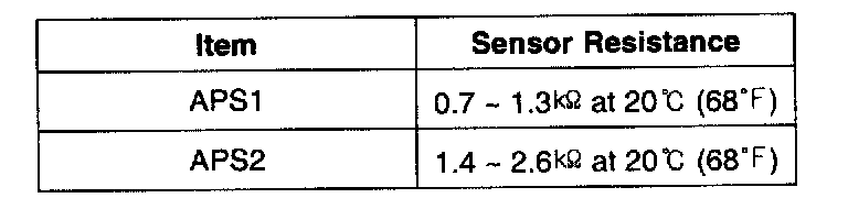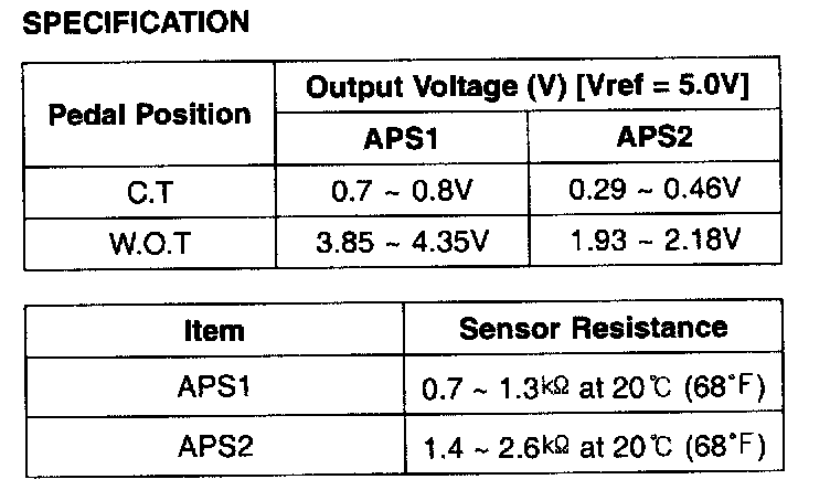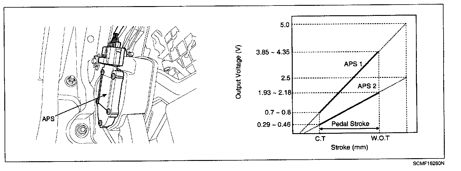 Accelerator Position Sensor (APS) is installed on the accelerator pedal module and detects the rotation angle of the accelerator pedal. The APS is one of the most important sensors in engine control system, so it consists of the two sensors which adapt individual sensor power and ground line. The second sensor monitors the first sensor and its output voltage is half of the first one. If the ratio of the sensor 1 and 2 is out of the range (approximately 1/2), the diagnostic system judges that a malfunction has occurred.
